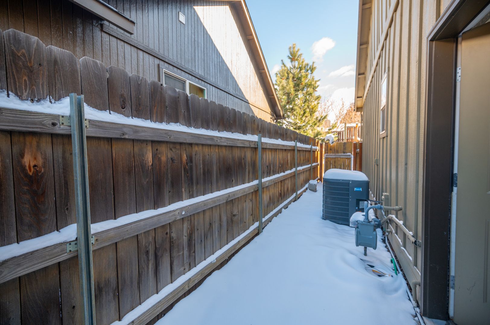 The backyard features low-maintenance composite granite, making it easy to care for.