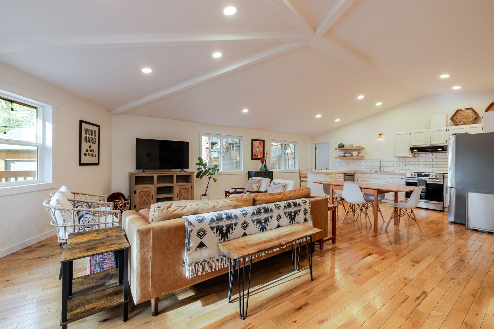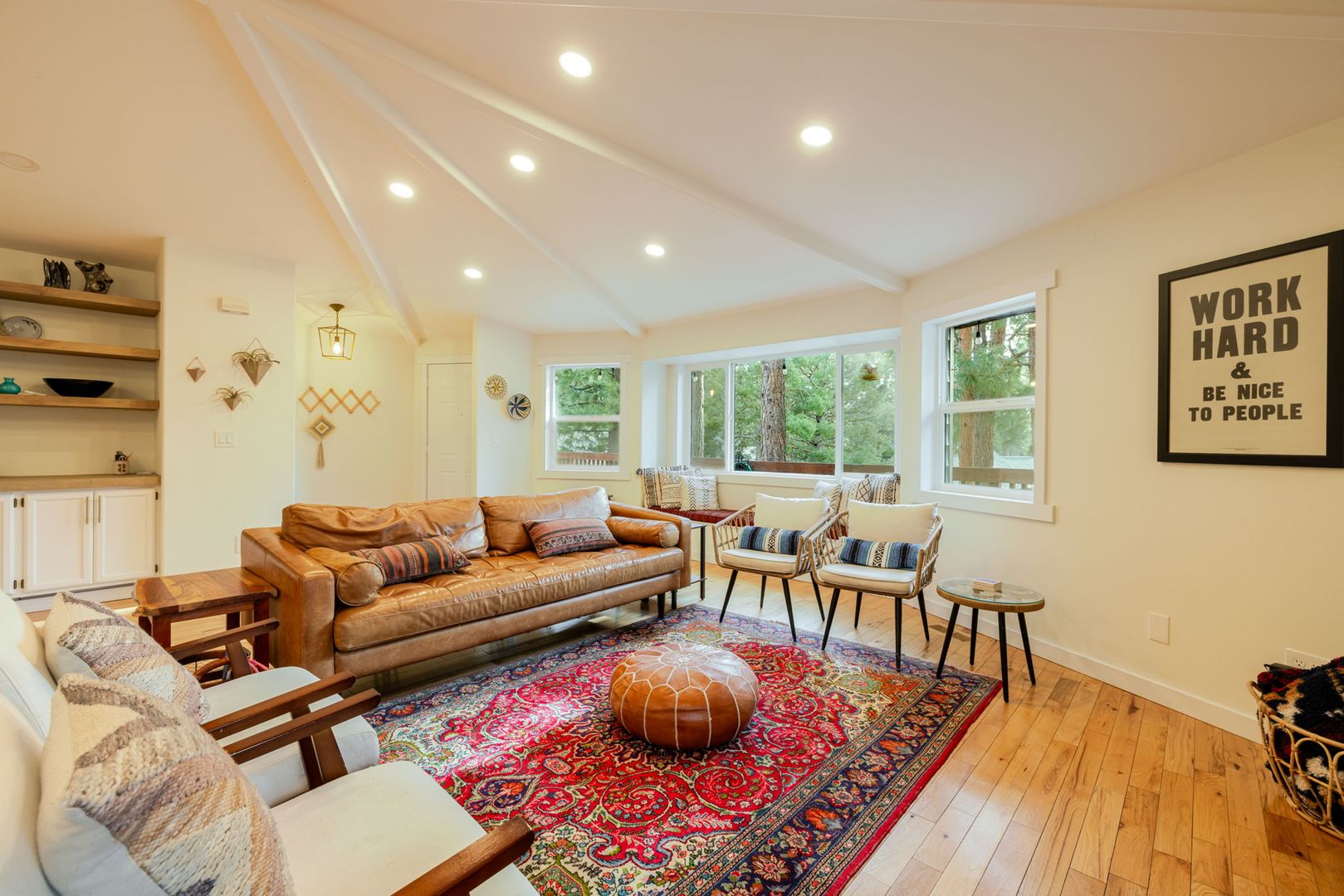 The home features a light-filled great room surrounded by windows creating a peaceful, treehouse-like feel. Vaulted ceilings enhance the sense of space, and the great room flows openly into the fully equipped kitchen, making it ideal for both everyday living and entertaining. Warm hardwood floors run throughout, complementing the thoughtfully furnished interior. The home includes three well-proportioned bedrooms that provide peaceful retreats, two decks—one off the front of the home and one in the back—extend the living space and offer flexibility for indoor-outdoor enjoyment.